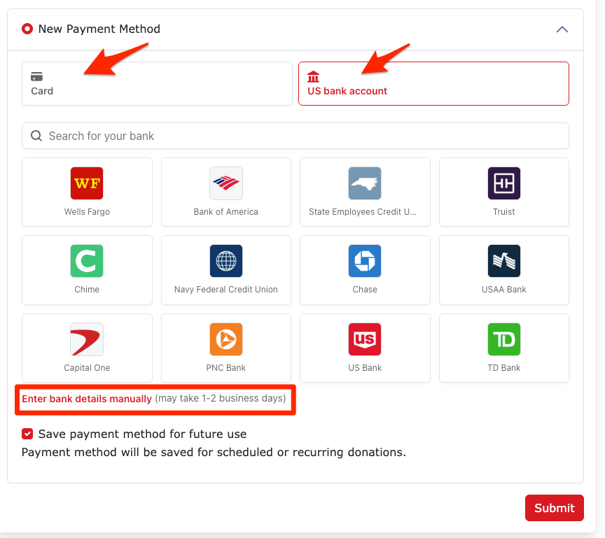 Donors can now connect a U.S. bank account for donations in two secure ways.